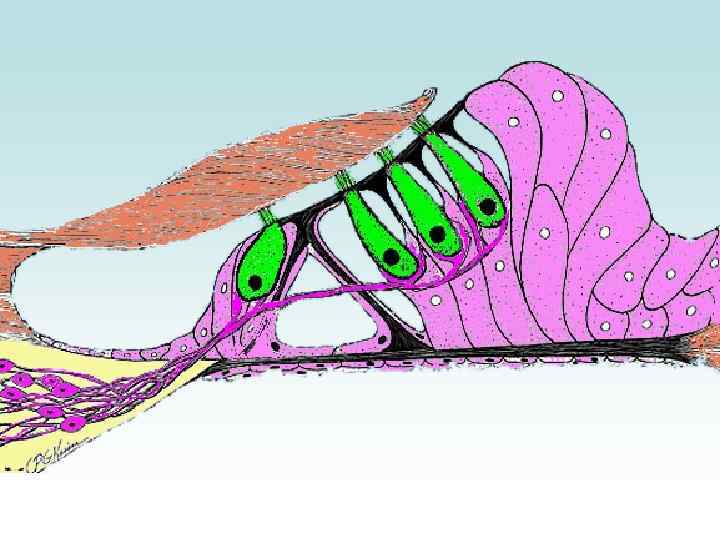 Развитие уха Высокие столбчатые эпителиальные клетки растущего ductus cochlearis становятся organum Corti (слуховые рецепторы).