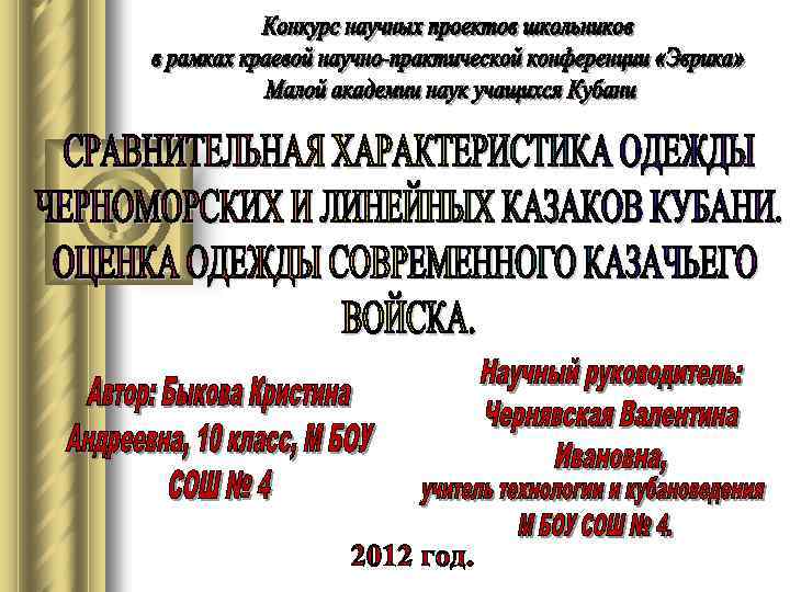 Цель работы: исследование повседневной и парадной одежды Черноморских и Линейных казаков. Затем исследовать одежду современного Кубанского казачьего войска и сделать оценку. Выделить сходства и различия формы казаков.