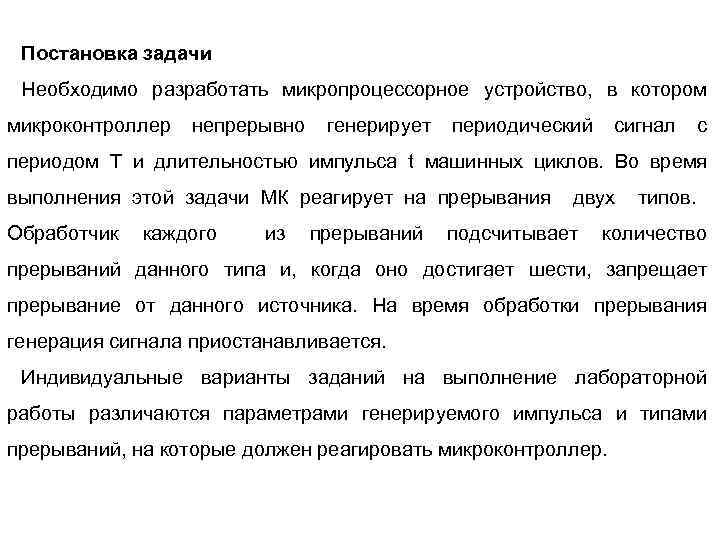 Постановка задачи Необходимо разработать микропроцессорное устройство, в котором микроконтроллер непрерывно генерирует периодический сигнал с периодом T и длительностью импульса t машинных циклов. Во время выполнения этой задачи МК реагирует на прерывания Обработчик каждого из прерываний двух подсчитывает типов. количество прерываний данного типа и, когда оно достигает шести, запрещает прерывание от данного источника. На время обработки прерывания генерация сигнала приостанавливается. Индивидуальные варианты заданий на выполнение лабораторной работы различаются параметрами генерируемого импульса и типами прерываний, на которые должен реагировать микроконтроллер.