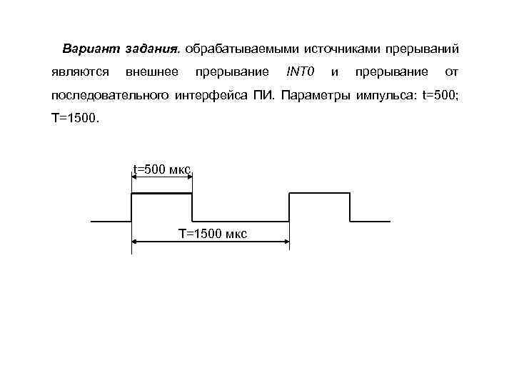 Вариант задания. обрабатываемыми источниками прерываний являются внешнее прерывание INT 0 и прерывание от последовательного интерфейса ПИ. Параметры импульса: t=500; T=1500. t=500 мкс T=1500 мкс
