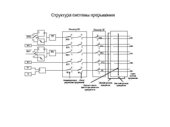 Структура системы прерывания Регистр IE 1 Регистр IP 1 TF 0 ET 0 1 INT 1 IE 1 0 IT 1 EX 1 1 TF 1 RI TI ET 1 1 ES 1 0 1 1 0 EX 0 1 0 IE 0 IT 0 0 0 INT 0 0 0 1 EA 1 1 0 1 PX 0 03 h 0 PT 0 0 Bh PX 1 1 13 h 0 1 0 PT 1 1 Bh 1 PS индивидуальное общее разрешение прерываний Низкий уровень Порядок опроса приоритета флагов при равенстве приоритетов 23 h Адрес вектора прерывания Высокий уровень приоритета