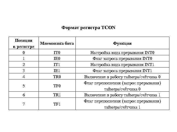 Формат регистра TCON Позиция в регистре 0 1 2 3 4 Мнемоника бита Функция IT 0 IE 0 IT 1 IE 1 TR 0 Настройка вида прерывания INT 0 Флаг запроса прерывания INT 0 Настройка вида прерывания INT 1 Флаг запроса прерывания INT 1 Включение в работу таймера/счётчика 0 Флаг переполнения (запрос прерывания) таймера/счётчика 0 Включение в работу таймера/счётчика 1 Флаг переполнения (запрос прерывания) таймера/счётчика 1 5 TF 0 6 TR 1 7 TF 1