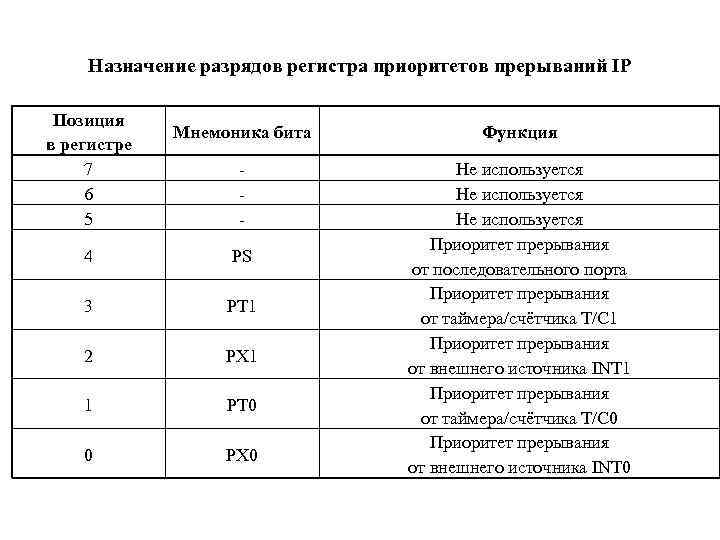 Назначение разрядов регистра разрешения прерываний IE Позиция Мнемоника Функция в регистре бита 7 EA Запрет прерывания от всех источников 6 Не используется 5 Не используется Запрет прерывания 4 ES от последовательного порта Запрет прерывания 3 ET 1 от таймера/счётчика T/C 1 Запрет прерывания 2 EX 1 от внешнего источника INT 1 Запрет прерывания 1 ET 0 от таймера/счётчика T/C 0 Запрет прерывания 0 EX 0 от внешнего источника INT 0