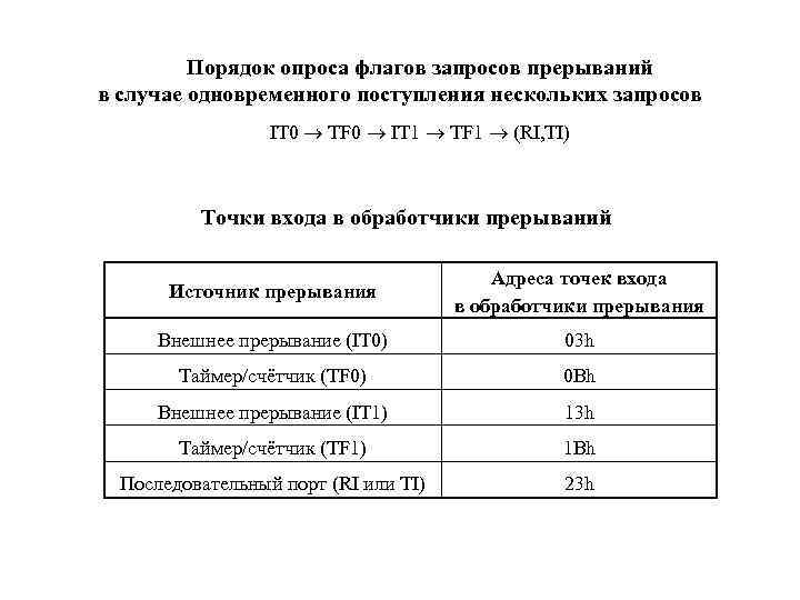 Порядок опроса флагов запросов прерываний в случае одновременного поступления нескольких запросов IT 0 TF 0 IT 1 TF 1 (RI, TI) Точки входа в обработчики прерываний Источник прерывания Адреса точек входа в обработчики прерывания Внешнее прерывание (IT 0) 03 h Таймер/счётчик (TF 0) 0 Bh Внешнее прерывание (IT 1) 13 h Таймер/счётчик (TF 1) 1 Bh Последовательный порт (RI или TI) 23 h