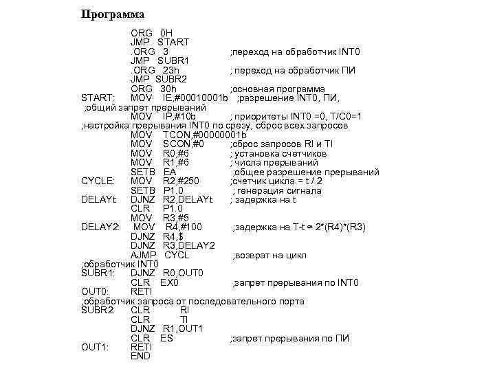Программа ORG 0 H JMP START. ORG 3 ; переход на обработчик INT 0 JMP SUBR 1. ORG 23 h ; переход на обработчик ПИ JMP SUBR 2 ORG 30 h ; основная программа START: MOV IE, #0001 b ; разрешение INT 0, ПИ, ; общий запpет прерываний MOV IP, #10 b ; приоритеты INT 0 =0, Т/С 0=1 ; настройка прерывания INT 0 по срезу, сброс всех запросов MOV TCON, #00000001 b MOV SCON, #0 ; сброс запросов RI и TI MOV R 0, #6 ; установка счетчиков MOV R 1, #6 ; числа прерываний SETB EA ; общее разрешение прерываний CYCLE: MOV R 2, #250 ; счетчик цикла = t / 2 SETB P 1. 0 ; генерация сигнала DELAYt: DJNZ R 2, DELAYt ; задержка на t CLR P 1. 0 MOV R 3, #5 DELAY 2: MOV R 4, #100 ; задержка на T-t ≈ 2*(R 4)*(R 3) DJNZ R 4, $ DJNZ R 3, DELAY 2 AJMP CYCL ; возвpат на цикл ; обработчик INT 0 SUBR 1: DJNZ R 0, OUT 0 CLR EX 0 ; запрет прерывания по INT 0 OUT 0: RETI ; обработчик запроса от последовательного порта SUBR 2: CLR RI CLR TI DJNZ R 1, OUT 1 CLR ES ; запрет прерывания по ПИ OUT 1: RETI END