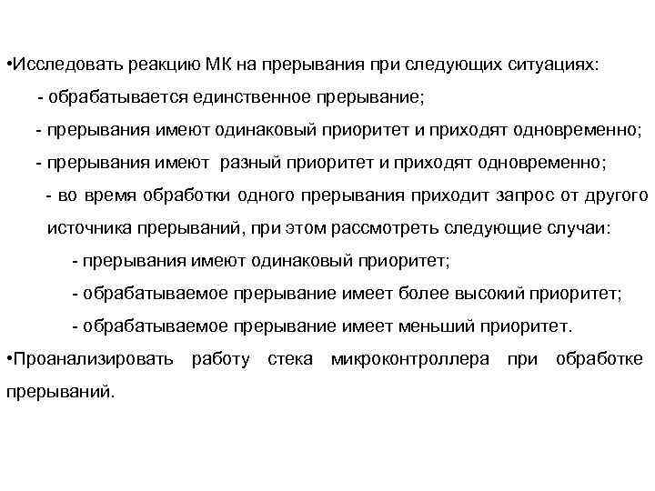 • Исследовать реакцию МК на прерывания при следующих ситуациях: - обрабатывается единственное прерывание; - прерывания имеют одинаковый приоритет и приходят одновременно; - прерывания имеют разный приоритет и приходят одновременно; - во время обработки одного прерывания приходит запрос от другого источника прерываний, при этом рассмотреть следующие случаи: - прерывания имеют одинаковый приоритет; - обрабатываемое прерывание имеет более высокий приоритет; - обрабатываемое прерывание имеет меньший приоритет. • Проанализировать работу стека микроконтроллера при обработке прерываний.