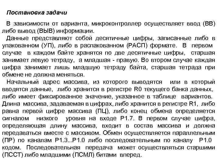 Постановка задачи В зависимости от варианта, микроконтроллер осуществляет ввод (ВВ) либо вывод (ВЫВ) информации. Данные представляют собой десятичные цифры, записанные либо в упакованном (УП), либо в распакованном (РАСП) формате. В первом случае в каждом байте хранятся по две десятичные цифры, старшая занимает левую тетраду, а младшая - правую. Во втором случае каждая цифра занимает лишь младшую тетраду байта, старшая тетрада при обмене не должна меняться. Начальный адрес массива, из которого выводятся или в который вводятся данные, либо хранится в регистре R 0 текущего банка данных, либо имеет фиксированное значение, указанное в таблице вариантов. Длина массива, задаваемая в цифрах, либо хранится в регистре R 1, либо равна первой цифре массива (ПЦ), либо конец обмена определяется сигналом низкого уровня на входе P 1. 7. В первом случае цифра, определяющая длину массива, входит в состав массива и должна передаваться вместе с массивом. Обмен осуществляется параллельным (ПР) по каналам P 1. 3. . . P 1. 0 либо последовательным по каналу P 1. 0 кодом. Последовательная передача может осуществляться старшими (ПССТ) либо младшими (ПСМЛ) битами вперед.