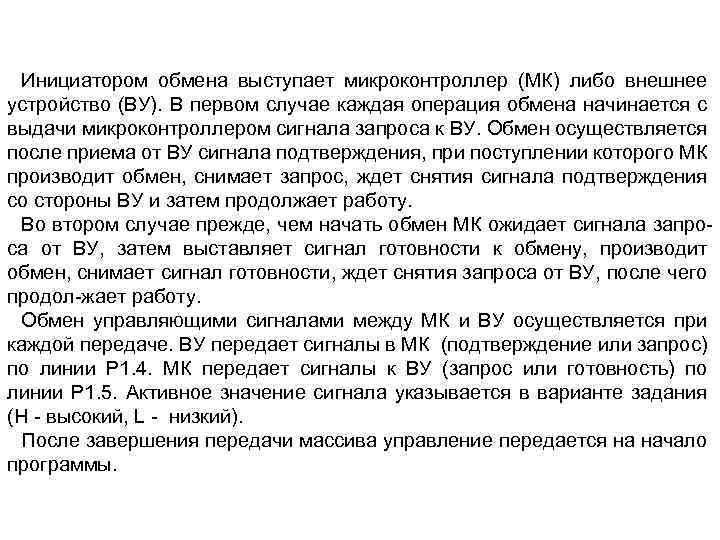 Инициатором обмена выступает микроконтроллер (МК) либо внешнее устройство (ВУ). В первом случае каждая операция обмена начинается с выдачи микроконтроллером сигнала запроса к ВУ. Обмен осуществляется после приема от ВУ сигнала подтверждения, при поступлении которого МК производит обмен, снимает запрос, ждет снятия сигнала подтверждения со стороны ВУ и затем продолжает работу. Во втором случае прежде, чем начать обмен МК ожидает сигнала запроса от ВУ, затем выставляет сигнал готовности к обмену, производит обмен, снимает сигнал готовности, ждет снятия запроса от ВУ, после чего продол-жает работу. Обмен управляющими сигналами между МК и ВУ осуществляется при каждой передаче. ВУ передает сигналы в МК (подтверждение или запрос) по линии Р 1. 4. МК передает сигналы к ВУ (запрос или готовность) по линии Р 1. 5. Активное значение сигнала указывается в варианте задания (Н - высокий, L - низкий). После завершения передачи массива управление передается на начало программы.