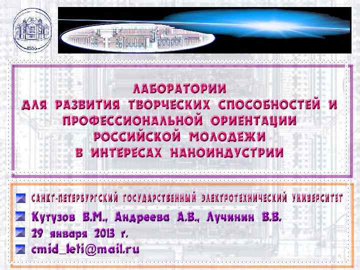 СЕКТОР «НАНОТЕХНОЛОГИИ» Методы получения наноструктурированных объектов Процессы синтеза из газовой фазы Процессы синтеза в жидкой фазе Получение углеродных нанотрубок из газовой фазы Получение нанослоевых органических композиций методом Ленгмюра-Блоджетт Атомно-молекулярная химическая сборка (ALD) Получение структурированных оксидов золь-гель технологией Электрохимическое формирование нанопористых материалов (Si, Si. C, Ga. N …) Амплификации ДНК методом полимеразной цепной реакции СЕКТОР «НАНОДИАГНОСТИКИ» Методы исследования и контроля нанообъектов Оптическая микроскопия с электрической нанозондовой диагностикой Растровая электронная микроскопия Атомно-силовая микроскопия Эллипсометрия Электронный парамагнитный резонанс Капиллярный электрофорез Санкт-Петербургский государственный электротехнический университет "ЛЭТИ", НОЦ «Нанотехнологии» , e-mail: сmid_leti@mail. ru