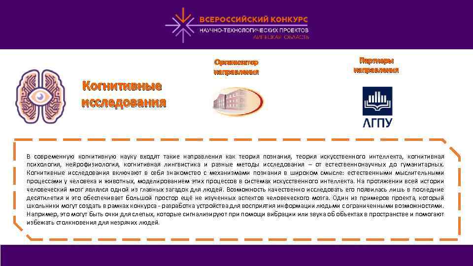 Организатор направления Партнеры направления Когнитивные исследования В современную когнитивную науку входят такие направления как теория познания, теория искусственного интеллекта, когнитивная психология, нейрофизиология, когнитивная лингвистика и разные методы исследования – от естественнонаучных до гуманитарных. Когнитивные исследования включают в себя знакомство с механизмами познания в широком смысле: естественными мыслительными процессами у человека и животных, моделированием этих процессов в системах искусственного интеллекта. На протяжении всей истории человеческий мозг являлся одной из главных загадок для людей. Возможность качественно исследовать его появилась лишь в последние десятилетия и это обеспечивает большой простор ещё не изученных аспектов человеческого мозга. Один из примеров проекта, который школьники могут создать в рамках конкурса - разработка устройства для восприятия информации людьми с ограниченными возможностями. Например, это могут быть очки для слепых, которые сигнализируют при помощи вибрации или звука об объектах в пространстве и помогают избежать столкновения для незрячих людей.
