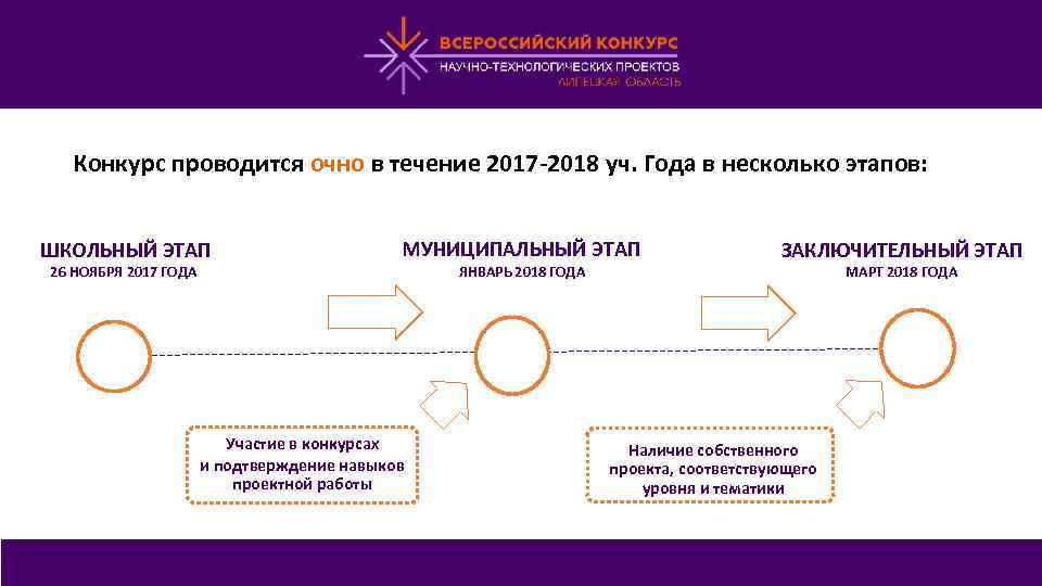 Конкурс проводится очно в течение 2017 -2018 уч. Года в несколько этапов: ШКОЛЬНЫЙ ЭТАП МУНИЦИПАЛЬНЫЙ ЭТАП 26 НОЯБРЯ 2017 ГОДА Участие в конкурсах и подтверждение навыков проектной работы ЯНВАРЬ 2018 ГОДА ЗАКЛЮЧИТЕЛЬНЫЙ ЭТАП МАРТ 2018 ГОДА Наличие собственного проекта, соответствующего уровня и тематики