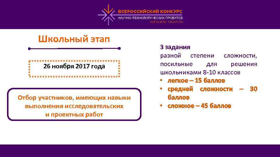 Школьный этап 26 ноября 2017 года Отбор участников, имеющих навыки выполнения исследовательских и проектных работ 3 задания разной степени сложности, посильные для решения школьниками 8 -10 классов • легкое – 15 баллов • средней сложности – 30 баллов • сложное – 45 баллов