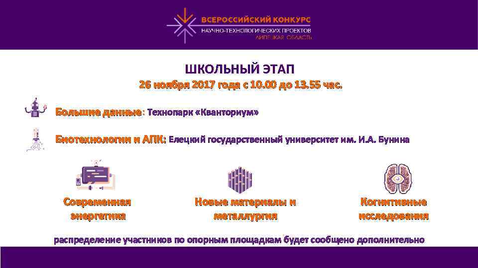 ШКОЛЬНЫЙ ЭТАП 26 ноября 2017 года с 10. 00 до 13. 55 час. Большие данные: Технопарк «Кванториум» Биотехнологии и АПК: Елецкий государственный университет им. И. А. Бунина Современная энергетика Новые материалы и металлургия Когнитивные исследования распределение участников по опорным площадкам будет сообщено дополнительно