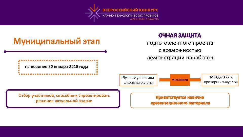 Муниципальный этап ОЧНАЯ ЗАЩИТА подготовленного проекта с возможностью демонстрации наработок не позднее 20 января 2018 года Лучшие участники школьного этапа Отбор участников, способных спроектировать решение актуальной задачи УЧАСТНИКИ Победители и призеры конкурсов Приветствуется наличие презентационного материала