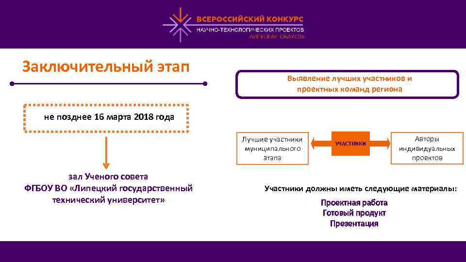 Заключительный этап Выявление лучших участников и проектных команд региона не позднее 16 марта 2018 года Лучшие участники муниципального этапа зал Ученого совета ФГБОУ ВО «Липецкий государственный технический университет» УЧАСТНИКИ Авторы индивидуальных проектов Участники должны иметь следующие материалы: Проектная работа Готовый продукт Презентация