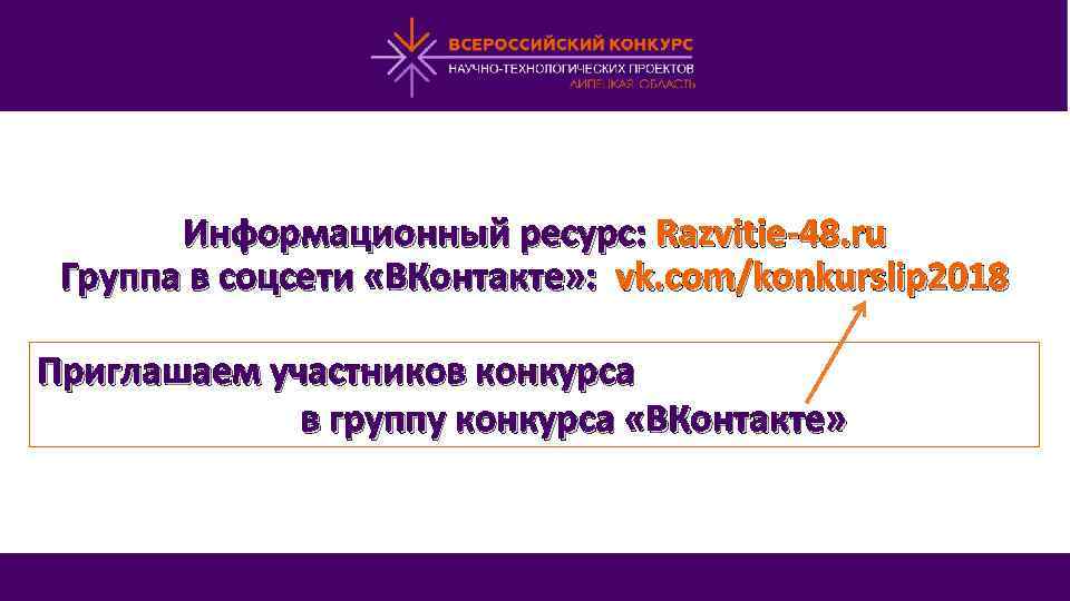 Информационный ресурс: Razvitie-48. ru Группа в соцсети «ВКонтакте» : vk. com/konkurslip 2018 Приглашаем участников конкурса в группу конкурса «ВКонтакте»