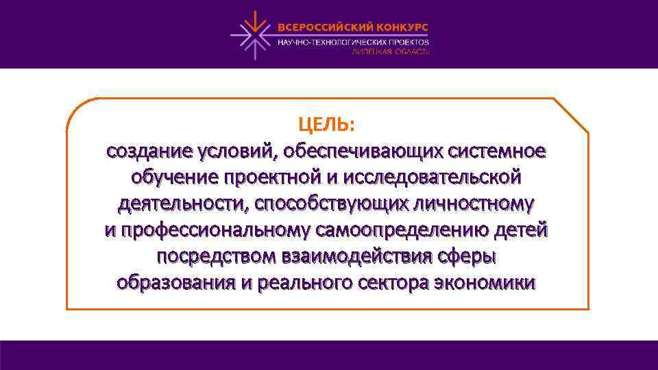 ЦЕЛЬ: создание условий, обеспечивающих системное обучение проектной и исследовательской деятельности, способствующих личностному и профессиональному самоопределению детей посредством взаимодействия сферы образования и реального сектора экономики