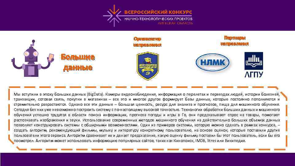 Организатор направления Партнеры направления Большие данные Мы вступили в эпоху больших данных (Big. Data). Камеры видеонаблюдения, информация о перелетах и переездах людей, истории болезней, транзакции, сотовая связь, покупки в магазинах – все это и многое другое формирует базы данных, которые постоянно пополняются и стремительно разрастаются. Однако все эти данные – большая ценность, ресурс для анализа и прогнозов, пища для машинного обучения. Сегодня без них уже невозможно построить систему с по-настоящему высокой точностью. Технологии обработки больших данных и машинного обучения успешно трудятся в области поиска информации, прогноза погоды и игры в Го, они предсказывают спрос на товары, помогают распознавать изображения и звуки. Использование современных методов машинного обучения на действительно больших объемах данных позволяет конструировать системы с обширными возможностями. Один из примеров системы, которую можно сделать в рамках конкурса, – создать алгоритм, рекомендующий фильмы, музыку и литературу конкретному пользователю, на основе оценок, которые поставили другие пользователи этого сервиса. Алгоритм сравнивает их и делает предсказание, какую оценку фильму поставил бы этот пользователь, если бы его посмотрел. Алгоритм может использовать информацию популярных сайтов, таких как Кинопоиск, IMDB, litres или Википедия.