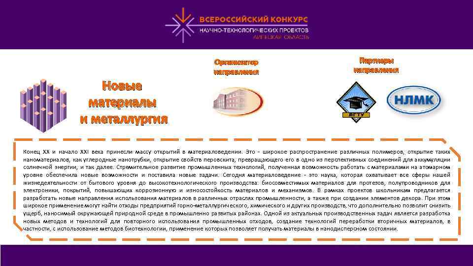 Организатор направления Партнеры направления Новые материалы и металлургия Конец XX и начало XXI века принесли массу открытий в материаловедении. Это - широкое распространение различных полимеров, открытие таких наноматериалов, как углеродные нанотрубки, открытие свойств перовскита, превращающего в одно из перспективных соединений для аккумуляции солнечной энергии, и так далее. Стремительное развитие промышленных технологий, полученная возможность работать с материалами на атомарном уровне обеспечила новые возможности и поставила новые задачи. Сегодня материаловедение - это наука, которая охватывает все сферы нашей жизнедеятельности от бытового уровня до высокотехнологического производства: биосовместимых материалов для протезов, полупроводников для электроники, покрытий, повышающих коррозионную и износостойкость материалов и механизмов. В рамках проектов школьникам предлагается разработать новые направления использования материалов в различных отраслях промышленности, а также при создании элементов декора. При этом широкое применение могут найти отходы предприятий горно-металлургического, химического и других производств, что дополнительно позволит снизить ущерб, наносимый окружающей природной среде в промышленно развитых районах. Одной из актуальных производственных задач является разработка новых методов и технологий для повторного использования промышленных отходов, создание технологий переработки вторичных материалов, в частности, с использование методов биотехнологии, применение которых позволяет получать материалы в нанодисперсном состоянии.
