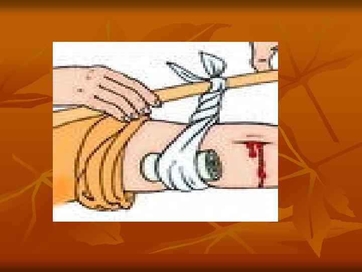 Первая помощь при артериальном кровотечении 1. Пережать сосуд выше места повреждения 2. Наложить жгут на конечность 3. Прикрепить записку с указанием времени наложения жгута 4. Отправить пострадавшего в медицинское учреждение
