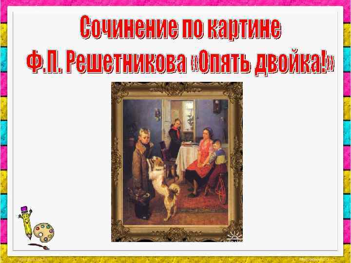 СЛОВАРНАЯ РАБОТА: КОМПОЗИЦИЯ - расположение фигур на картине Строгая, четкая композиция; удачная композиция; различные формы композиции; особенности композиции; композиция картины «Опять двойка!» хорошо продумана Ф. П. Решетниковым КОЛОРИТ - сочетание различных цветов Неяркий колорит картины соответствует будничному событию; колорит картины имеет большое значение для раскрытия замысла художника