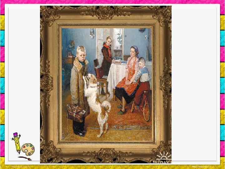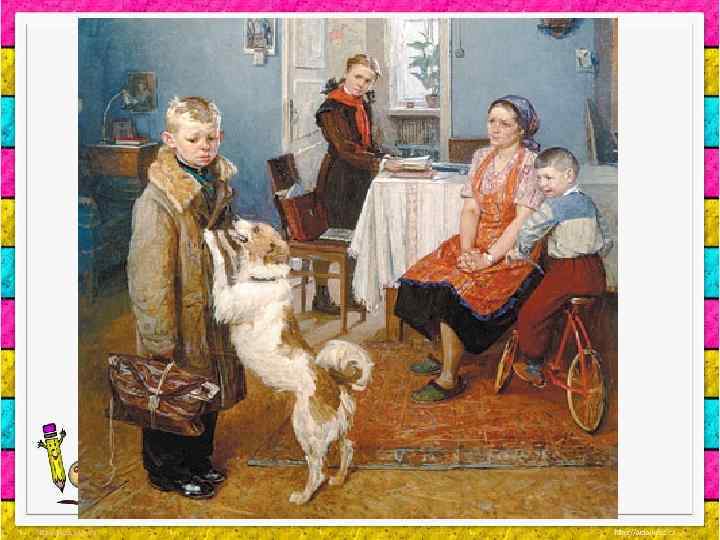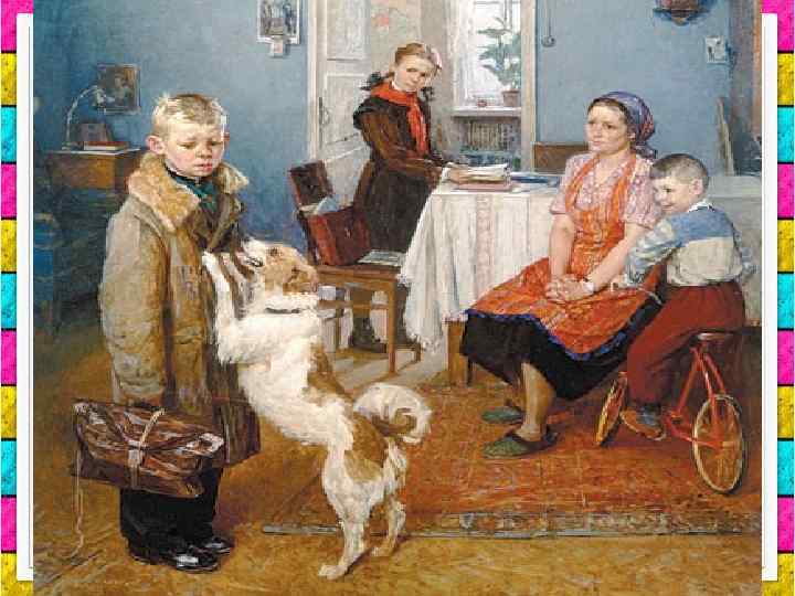 ПЛАН СОЧИНЕНИЯ 1. Главный герой, его возраст, внешний облик, одежда, поза. 2. Портфель. 3. Мать героя, ее внешний облик, настроение. 4. Сестра. 5. Младший брат. 6. Собака. 7. Описание картины. 8. Основная мысль картины. 9. Мое отношение к картине.
