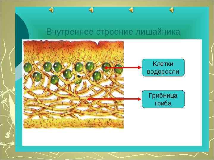 Лишайники – это симбиотические представители царства грибов. Лихенология - наука о лишайниках Лихенолог – человек, занимающийся изучением лишайников. Внутреннее строение лишайников: лишайники это симбиотические организмы, их тело состоит из водоросли и гриба. Тело или таллом представлен переплетающимися грибными нитями и одноклеточными зелеными или сине-зелеными водорослями. На грибных нитях иногда образуются присоски, которые проникают внутрь водорослей.