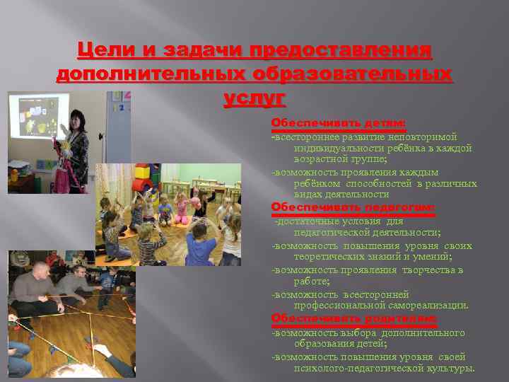Цели и задачи предоставления дополнительных образовательных услуг Обеспечивать детям: -всестороннее развитие неповторимой индивидуальности ребёнка в каждой возрастной группе; -возможность проявления каждым ребёнком способностей в различных видах деятельности Обеспечивать педагогам: -достаточные условия для педагогической деятельности; -возможность повышения уровня своих теоретических знаний и умений; -возможность проявления творчества в работе; -возможность всесторонней профессиональной самореализации. Обеспечивать родителям: -возможность выбора дополнительного образования детей; -возможность повышения уровня своей психолого-педагогической культуры.