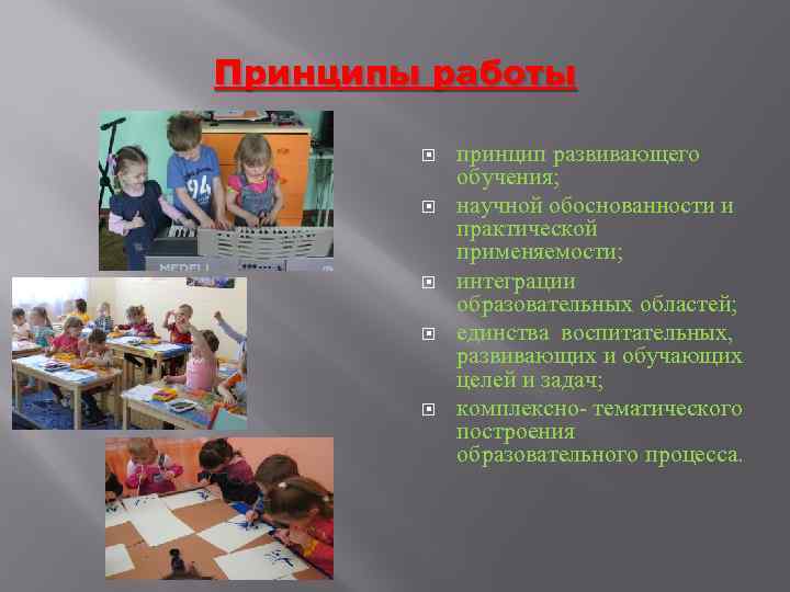 Принципы работы принцип развивающего обучения; научной обоснованности и практической применяемости; интеграции образовательных областей; единства воспитательных, развивающих и обучающих целей и задач; комплексно- тематического построения образовательного процесса.