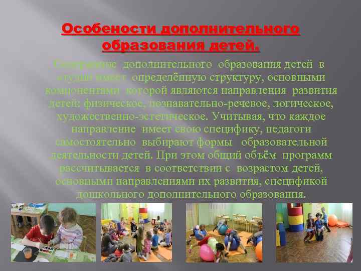 Особености дополнительного образования детей. Содержание дополнительного образования детей в студии имеет определённую структуру, основными компонентами которой являются направления развития детей: физическое, познавательно-речевое, логическое, художественно-эстетическое. Учитывая, что каждое направление имеет свою специфику, педагоги самостоятельно выбирают формы образовательной деятельности детей. При этом общий объём программ рассчитывается в соответствии с возрастом детей, основными направлениями их развития, спецификой дошкольного дополнительного образования.