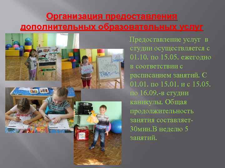 Организация предоставления дополнительных образовательных услуг Предоставление услуг в студии осуществляется с 01. 10. по 15. 05. ежегодно в соответствии с расписанием занятий. С 01. по 15. 01. и с 15. 05. по 16. 09. -в студии каникулы. Общая продолжительность занятия составляет30 мин. В неделю 5 занятий.