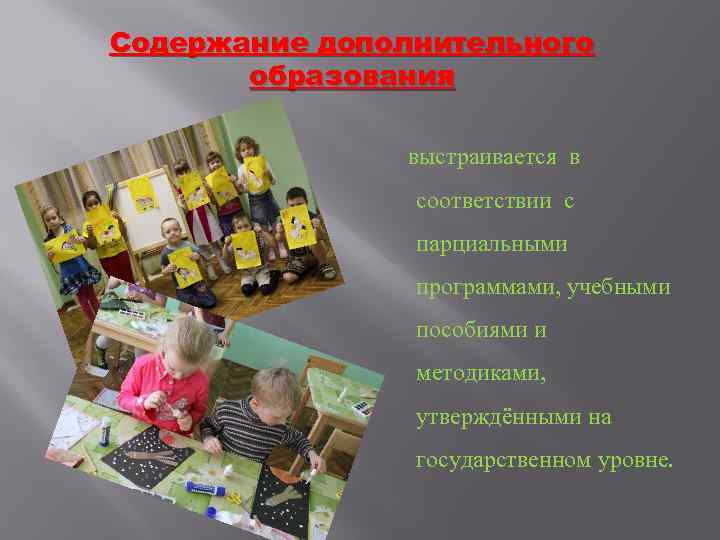 Содержание дополнительного образования выстраивается в соответствии с парциальными программами, учебными пособиями и методиками, утверждёнными на государственном уровне.