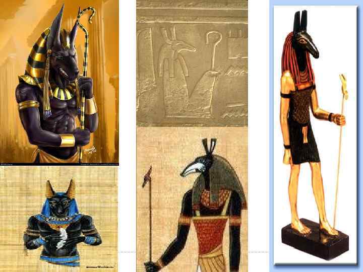 Анубис – бог покровитель мёртвых Анубис — бог - покровитель мертвых, создатель погребальных обрядов, сын бога растительности Осирис и Нефтиды, сестры Исиды. Анубиса изображали в виде человека с головой шакала или дикой собаки чёрного цвета.