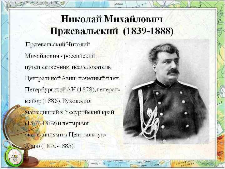 Развитие теоретических работ - руководитель экспедиции в Уссурийский край (1867 -69 гг), исследователь Центральной Азии (1870 -1885), собрал ценные коллекции диких растений и животных. ПРЖЕВАЛЬСКИЙ НИКОЛАЙ МИХАЙЛОВИЧ