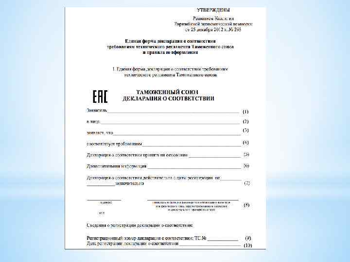 Декларирование соответствия - форма обязательного подтверждения соответствия выпускаемой в обращение продукции требованиям технических регламентов Союза; Декларация о соответствии техническим регламентам Союза - документ, которым заявитель удостоверяет соответствие выпускаемой в обращение продукции требованиям технических регламентов Союза.