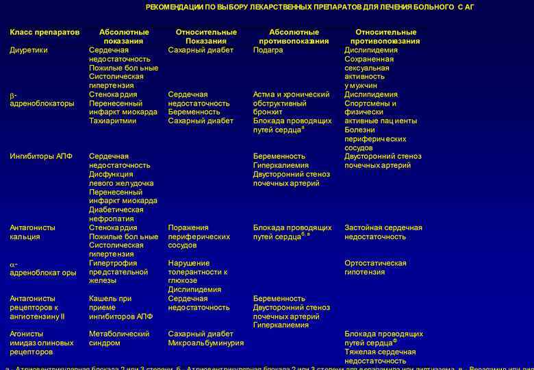 Принципы лекарственной терапии -применять низкие дозы антигипертензивных средств на начальном этапе лечения, начиная с наименьшей дозировки препарата с целью уменьшить неблагоприятные побочные эффекты. Если имеется хорошая реакция на низкую дозу данного препарата, но контроль АД все еще недостаточен, целесообразно увеличить дозировку этого препарата при условии его хорошей переносимости; - использовать эффективные комбинации низких и средних доз антигипертензивных препаратов с целью максимального снижения АД и хорошей переносимости. При неэффективности первого препарата предпочтительнее добавление малой дозы второго препарата, чем повышение дозировки исходного. Перспективно использование фиксированных низкодозовых комбинаций
