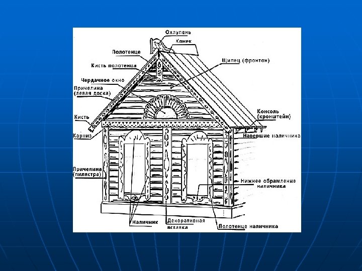 Деталь русской избы Конструктивное назначение Деталь кровли в традиционном русском жилище, изготовлялась из целого бревна в виде буквы V в сечении. Конец этого бревна вырубался в виде головы коня. Украшение «чела» дома. В архитектуре Руси IX-Xвв. висячие доски с резным орнаментом, покрывающие торцы бревен сруба и края крыши. Горизонтальный продольный выступ на стене, поддерживающий крышу здания (или козырек) Верхняя треугольная часть дома, ограниченная двумя скатами крыши и карнизом у основания. Резное украшение окна