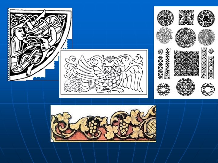Орнаменты Характеристика орнамента В качестве мотивов использует в изображении стилизованные фигурки животных и птиц. В качестве мотивов использует мужские и женские стилизованные фигуры или отдельные части тела человека. орнамент составляется из геометрических фигур и солярных знаков орнамент составляется из стилизованных листьев, цветов, плодов, веток и т. д.