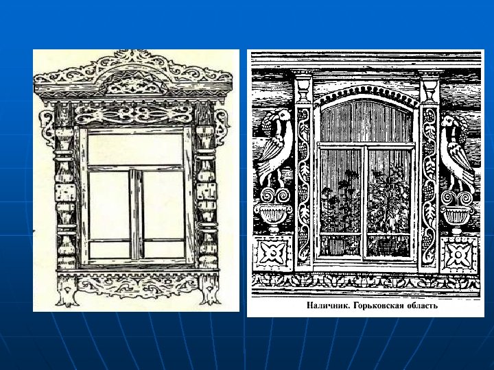 НАЛИЧНИКИ ОКОН Резьбой и росписью по дереву украшались наличники окон и ставни. Ставни прикрывали окна дома от ветра и дневного света.