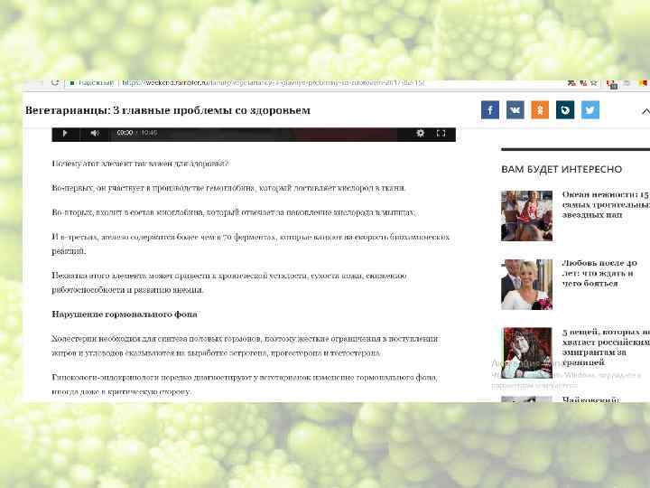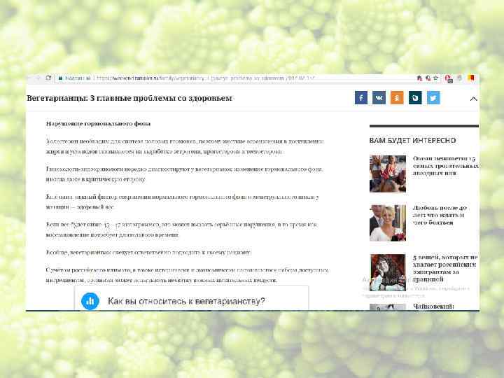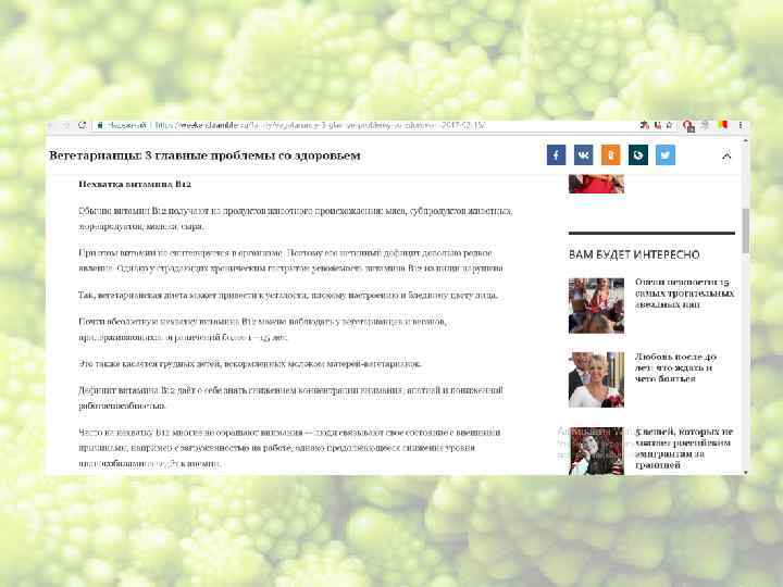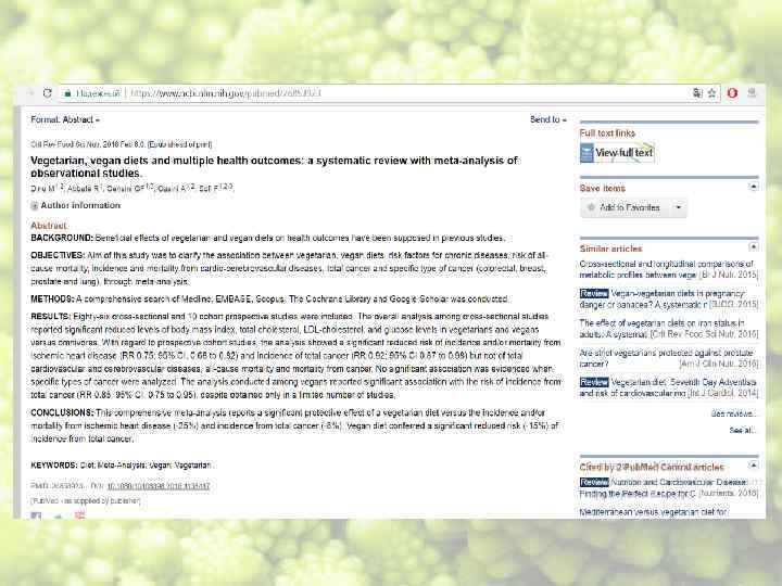 9. Шведское управлению по питанию «В том, чтобы быть вегетарианцем, нет ничего сложного, нужно только следовать базовым знаниям о питании. Строгим вегетарианцам может потребоваться витамин B 12 и D в качестве добавок» . «Диета с большим количеством овощей, корнеплодов, бобовых и цельных зёрен полезна как для здоровья, так и для окружающей среды. Поэтому хорошо, если дети приучаются есть эти продукты в раннем возрасте, это увеличивает вероятность того, что они будут продолжать делать это и в дальнейшем» http: //www. livsmedelsverket. se/matvanor-halsa--miljo/. . 10. Швейцарское ведомство здоровья «Достаточное потребление витамина B 12 веган может получить только из специальных добавок, но все остальные питательные вещества, включая кальций и железо, могут быть получены из растительных продуктов» https: //www. blv. admin. ch/blv/de/home. html 11. Министерство здравоохранения Израиля «Вегетарианская диета, соблюдающаяся разумно, может предоставить все необходимые продукты для нужд ребенка от рождения и до старости. Дети вегетарианцы прекрасно растут, если их меню включает все необходимые компоненты в достаточном количестве, и если они питаются в соответствии с рекомендациями питания для всех детей их возраста» http: //www. health. gov. il/Russian/Subjects/pregnancy_a. . 12. Министерство здравоохранения Латвии «Министерство здравоохранения согласно, что вегетарианская и веганская диеты на здоровых и растительных продуктах способны обеспечить человека всеми необходимыми питательными веществами» http: //www. tvnet. lv/zala_zeme/zala_dzive/171910 -vesel. .