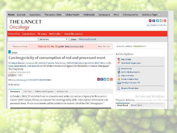 КАНЦЕРОГЕННОСТЬ ПОТРЕБЛЯЕМОГО КРАСНОГО И ОБРАБОТАННОГО МЯСА • • • В октябре 2015 года 22 учёных из десяти стран встретились в Международном агентстве по изучению рака (IARC) в Лионе (Франция) для оценки канцерогенности потребления сырого и обработанного красного мяса. Их выводы должны быть опубликованы в 114 томах монографии IARC. Красное мясо — необработанные части мышц млекопитающих, как то: говядина, телятина, свинина, баранина, ягнятина, конина или козлятина, включая фарш или замороженное мясо; обычно оно употребляется после приготовления. Обработанное мясо — мясо, приготовленное путем засолки, варки, ферментации, копчения или других процессов для улучшения вкуса или же увеличения сроков хранения. Чаще всего обработанное мясо — это свинина или говядина, но к нему можно также отнести другие сорта, домашнюю птицу, требуху, или субпродукты, например, печень или кровь. Красное мясо содержит белки высокой биологической ценности и важные микроэлементы, такие как витамины группы В, железо (свободное и связанное с гемом) и цинк. Содержание жира в красном мясе варьируется в зависимости от вида животного, возраста, пола, породы, корма, а также части туши. Переработка мяса, к примеру, варка или копчение, может привести к образованию канцерогенных химических веществ, в том числе N-нитрозо-соединений (NOC) и полициклических ароматических углеводородов (ПАУ). Приготовление пищи не только улучшает усвояемость и вкусовые качества мяса, но и может привести к формированию известных или предполагаемых канцерогенов, в том числе гетероциклических ароматических аминов (НАА) и ПАУ. Кулинарная обработка пищи при высокой температуре с помощью обжаривания, приготовления на гриле или барбекю в целом производит наибольшее количество этих соединений. Средний уровень потребления красного мяса среди рядовых потребителей составляет около 50 -100 г на человека в день, при этом высокий уровень потребления оценивается более чем в 200 г на человека в день. О потреблении обработанного мяса доступной информации меньше. Рабочая группа дала оценку более чем 800 эпидемиологическим исследованиям, изучавшим корреляцию заболеваемости раком с потреблением красного или обработанного мяса во многих странах, на нескольких континентах, с вовлечением различных этнических групп и рационов. Наиболее значимыми для оценки были проспективные когортные исследования, проведённые в общей популяции. Высококачественные выборочные исследования на основе общей популяции населения предоставляли дополнительные доказательства. В разработке проекта как тех, так и других, относимыми к наиболее информативным исследованиям оказались те, что рассматривали отдельно потребление красного и обработанного мяса, имели количественные сведения по рациону, полученные из проверенных опросников, большой размер выборки, и контролировались по основным потенциальным конфаундерам (вмешивающимся факторам, прим. ред. ), имеющим отношение к локализации опухоли.