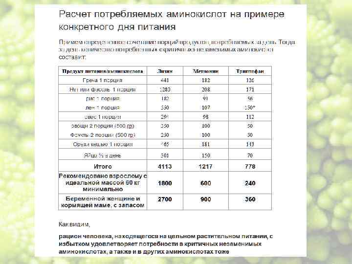Цельное растительное питание: 1. Не вредно. Позволяет обеспечить организм всеми необходимыми макро- микронутриентами в достаточном количестве. 2. Полезно. Позволяет существенно снизить риск онкологических и сердечно-сосудистых заболеваний, а также диабета, метаболического синдрома, гипертонической болезни и т. д. 3. Обеспечивает здоровье планеты, то есть лучшую экологию, то есть и, следовательно, каждого человека в отдельности. 4. Обеспечивает душевное здоровье и равновесие, освобождение от соучастия в массовых убийствах и жестоком обращении с животными, избавляет от глубинного чувства вины. 5. Дает путь к построению более гуманной, справедливой и эффективной модели развития цивилизации.