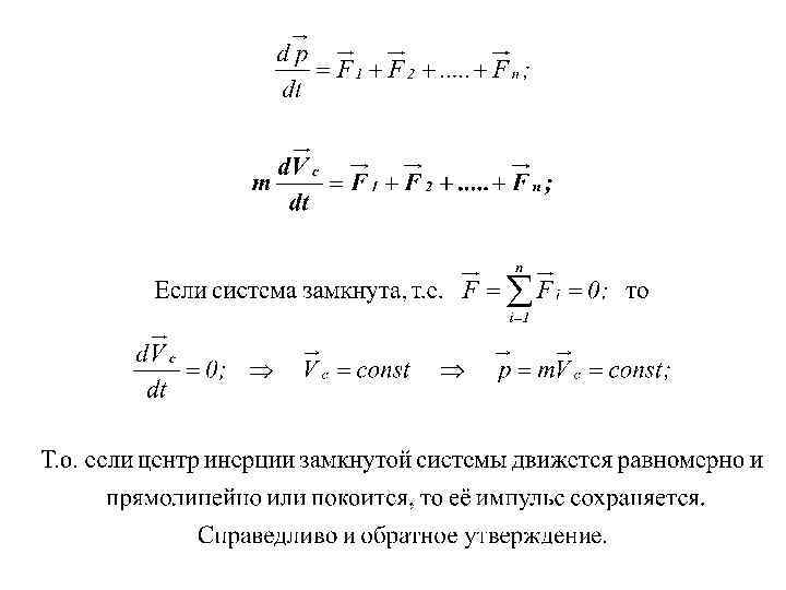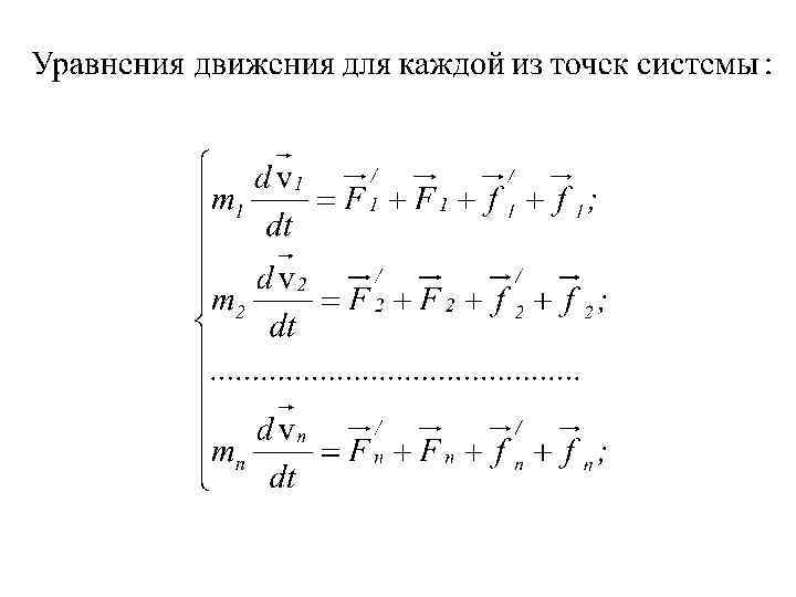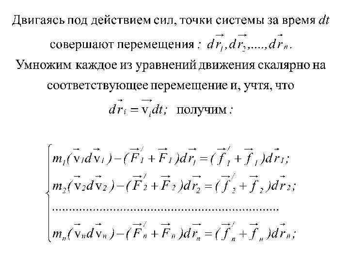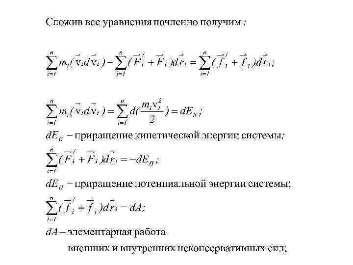 Закон сохранения энергии Пусть материальные точки массами m 1, m 2, …. , mn образуют механическую систему и движутся со скоростями v 1, v 2, …, vn. Пусть - равнодействующие внутренних консервативных сил, действующих на каждую из этих точек; - равнодействующие внешних консервативных сил; - равнодействующие внутренних неконсервативных сил; - равнодействующие внешних неконсервативных сил;