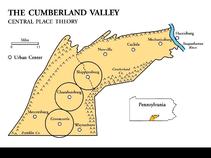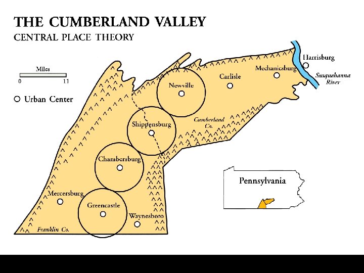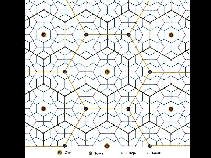 POSTULATES or OUTCOMES “Then. . . “ • There will be a regular spatial order in the number of central places of different population sizes. – Few large places – Many small places • There will be a regular spatial order in the spacing of central places of different population sizes. – Large places relatively farther apart – Small places relatively closer together