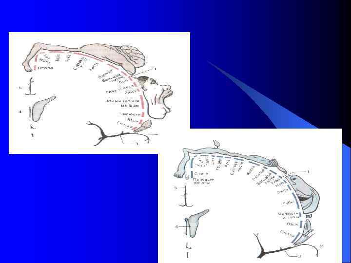 Динамическая локализация функций в коре полушарий. l l Проекционный центр общей чувствительности (тактильной, болевой, температурной, сознательной проприоцептивной) постцентральная извилина. Проекционный центр двигательного анализатора предцентральная извилина и парацентральная долька.