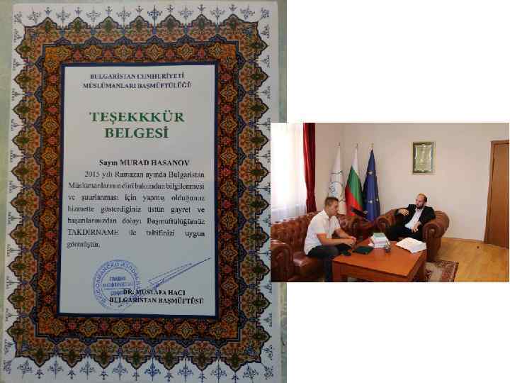 Заключительная встреча в Главном Муфтийстве г. София с заместителем главного муфтия – Ахмадом Ходжи Ведатом, вручение подарков, отчет о практике, делимся впечатлениями Переданы подарки для ЦДУМ России и Ректора РИУ: эмблема Муфтийства, книги по истории Главного Муфтийства Болгарии, книга по истории турков в Болгарии, книга-отчет о работе Муфтийства за 20112014 годы, подборка исламских журналов издаваемых в Болгарии, а также благодарственное письмо за участие в практике.