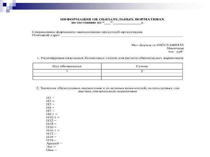 ИНФОРМАЦИЯ ОБ ОБЯЗАТЕЛЬНЫХ НОРМАТИВАХ Код формы по ОКУД 0409135 Месячная 1. 2. 3. 4. 5. Расшифровки отдельных балансовых счетов для расчета обязательных нормативов Значения обязательных нормативов и отдельных показателей, используемых для расчета обязательных нормативов Информация о нарушении обязательных нормативов Число операционных дней в отчетном месяце Даты нерабочих дней отчетного месяца Отчет составляется в целом по кредитной организации (включая НКО) по состоянию на 1 -е число месяца, следующего за отчетным