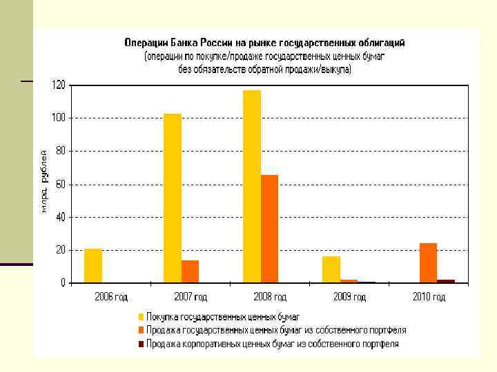 Операции Банка России по покупке/продаже ценных бумаг на открытом рынке В практике Банка России покупка/продажа корпоративных ценных бумаг использовалась только в рамках операций РЕПО, либо при реализации ценных бумаг, полученных в обеспечение по сделкам РЕПО, при ненадлежащем исполнении контрагентами своих обязательств по второй части сделки. Прямые операции по покупке/продаже государственных ценных бумаг без обязательств обратной продажи/выкупа используются Банком России нерегулярно. Операции по покупке/продаже государственных ценных бумаг на вторичном рынке могут осуществляться как через секцию государственных ценных бумаг ЗАО ММВБ, так и на внебиржевом рынке. Участниками данных операций могут являться только российские кредитные организации.