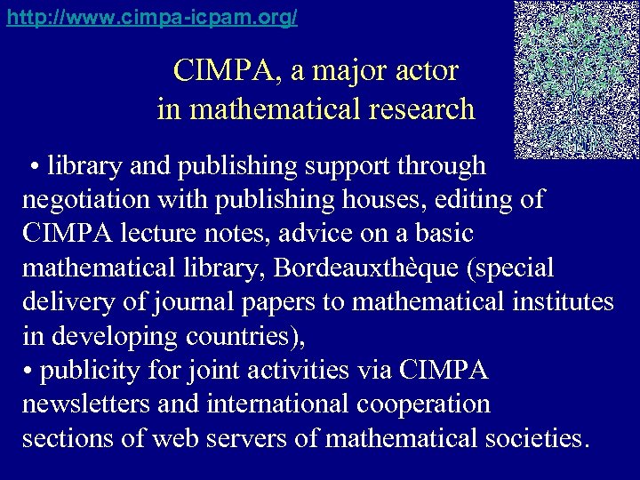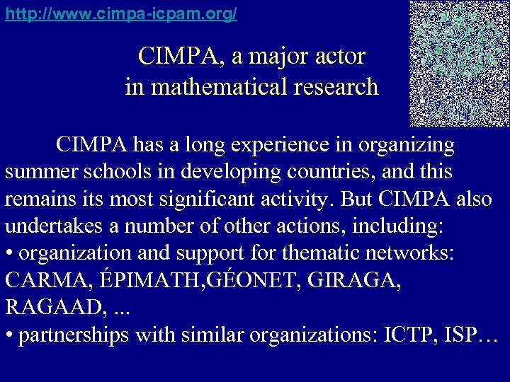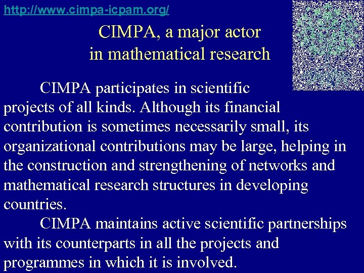 http: //www. cimpa-icpam. org/ CIMPA, a major actor in mathematical research CIMPA participates in scientific projects of all kinds. Although its financial contribution is sometimes necessarily small, its organizational contributions may be large, helping in the construction and strengthening of networks and mathematical research structures in developing countries. CIMPA maintains active scientific partnerships with its counterparts in all the projects and programmes in which it is involved.