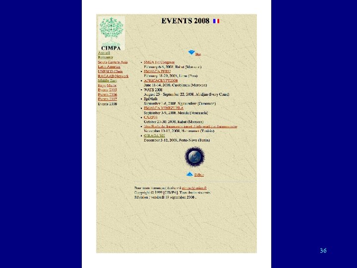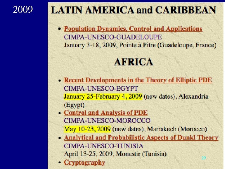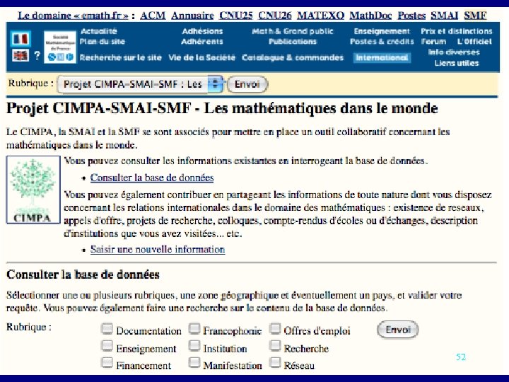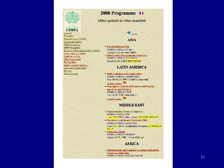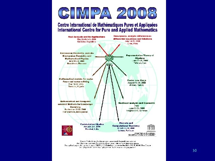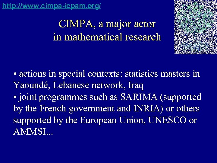 http: //www. cimpa-icpam. org/ CIMPA, a major actor in mathematical research • actions in special contexts: statistics masters in Yaoundé, Lebanese network, Iraq • joint programmes such as SARIMA (supported by the French government and INRIA) or others supported by the European Union, UNESCO or AMMSI. . .